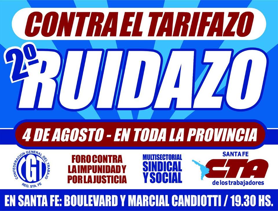 La movilización de la CTA y la CGT Regional Santa Fe marchó desde la Plaza Pueyrredon hasta la esquina de Bv. Gálvez y Marcial Candioti, en donde la columna se sumó a una importante cantidad de santafesinos que protestaron contra la fuerte e indiscriminada suba de tarifas que dispuso el Gobierno Nacional. La protesta se realizó también en los principales centros urbanos de todo el paÃs.