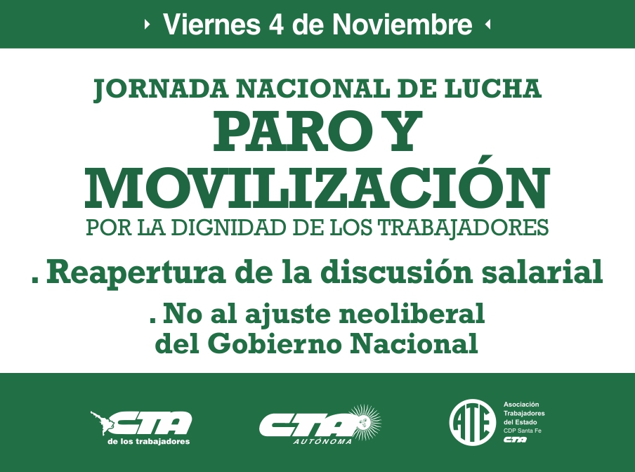 Este viernes 4 de noviembre la Asociación Trabajadores del Estado – ATE CDP Santa Fe convocó a un paro y movilización en todo el ámbito de la administración pública nacional y provincial. La medida de fuerza se hará sentir en los hospitales –donde también adhirieron los profesionales nucleados en SIPRUS, donde se garantizarán las guardias mÃnimas; en escuelas y en las diferentes dependencias públicas ministeriales y en organismos nacionales.