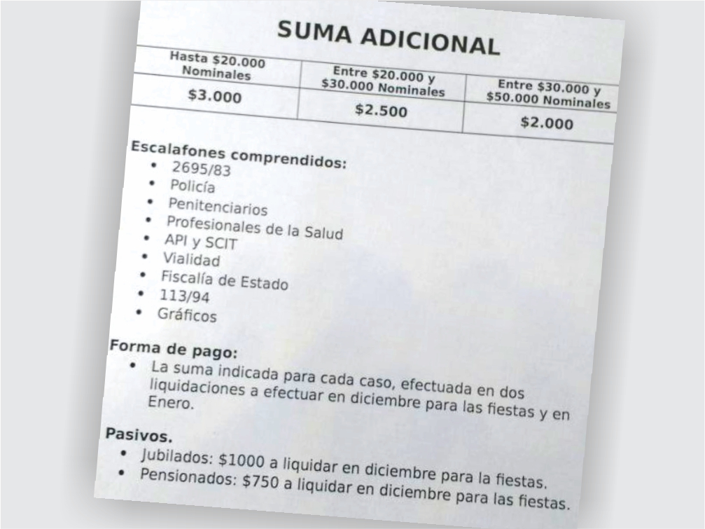 Para los trabajadores activos se pagará en dos partes: la primera cuota en diciembre para las Fiestas, y la otra los primeros días de enero luego de abonarse el cronograma de pagos. Asimismo, se especifica que será de 3 mil pesos para quienes cobran hasta 20 mil pesos nominales y de 2500 pesos para los que cobran entre 20 mil y 30 mil pesos nominales. En tanto, 2 mil pesos para quienes perciben haberes de más de 30 mil pesos nominales. Para los Jubilados y Pensionados será de $ 1.000 para los primeros y $ 750 para los segundos, por única vez y a pagar en Diciembre.