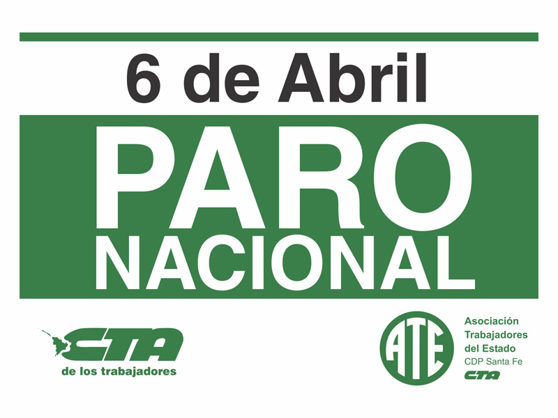 Este jueves 6 de abril, todas las centrales obreras del país, las CTA de los Trabajadores, Autónoma y la CGT, llevan a cabo un paro total por 24 horas “en demanda del cambio en las políticas económicas que están afectando la vida de los trabajadores y de los sectores populares”, explicó Jorge Hoffmann, Sec. Gral. de la Asociación Trabajadores del Estado –ATE- Santa Fe y Sec. Adjunto de la CTA T.