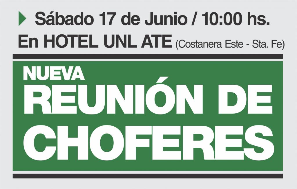 Este sábado 17 de junio a las 10 horas se llevará a cabo un nuevo encuentro de choferes en el Hotel UNL ATE. Dicho encuentro fue definido para la numerosa e inédita asamblea realizada el pasado lunes 12 de junio en Casa de Gobierno donde se exigió la inmediata implementación del Agrupamiento para el sector.
