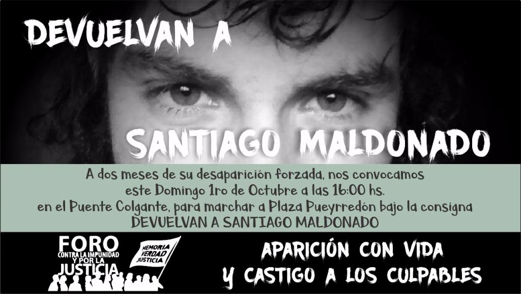 Este domingo 1° de octubre a las 16 hs nos concentramos en el Puente Colgante y marchamos a Plaza Pueyrredón para exigir que DEVUELVAN A SANTIAGO MALDONADO. Además reclamamos: Castigo a los culpables y vigencia del Estado de Derecho.