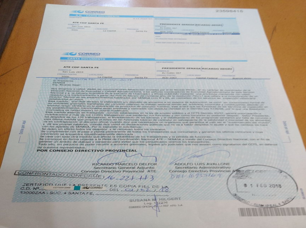 En el marco del Paro Nacional de 96 horas, convocado por ATE SENASA, en la Provincia de Santa Fe se realizó una concentración frente a la sede de la Regional SENASA. Posteriormente, se llevo a cabo una asamblea donde se definió continuar con el estado de alerta y movilización permanente y enviar una Carta Documento al Presidente del organismo a quien le solicitamos: