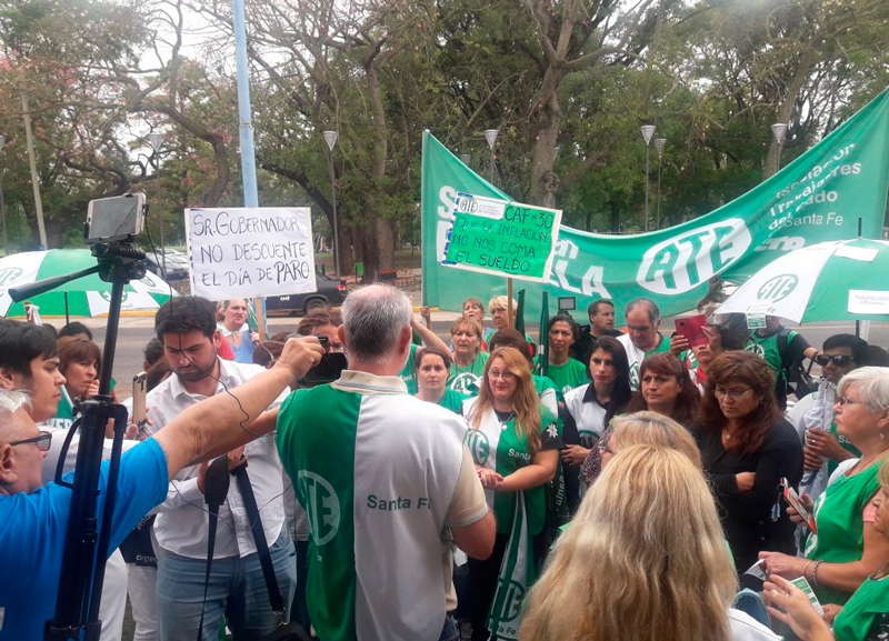 Los trabajadores/as junto a miembros del CDP ATE Santa Fe le solicitaron al mandatario provincial la reapertura de la paritaria del sector público y denunciaron persecución ante la amenaza de descontar el día de paro.