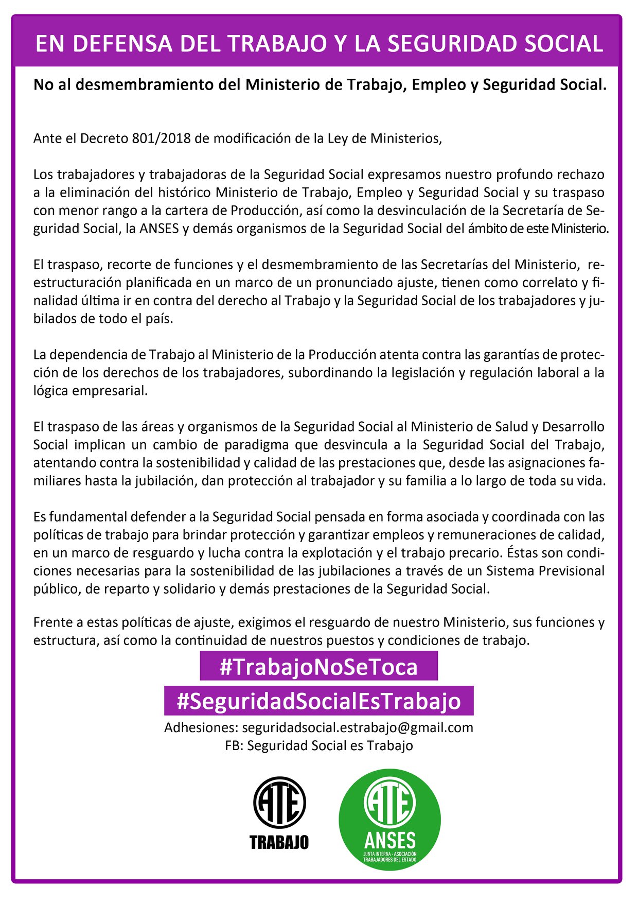 Entendemos que el traspaso, recorte de funciones y el desmembramiento de las Secretarías del Ministerio, implican un ataque a los derechos del Trabajo y la Seguridad Social de los trabajadores y jubilados de todo el país.