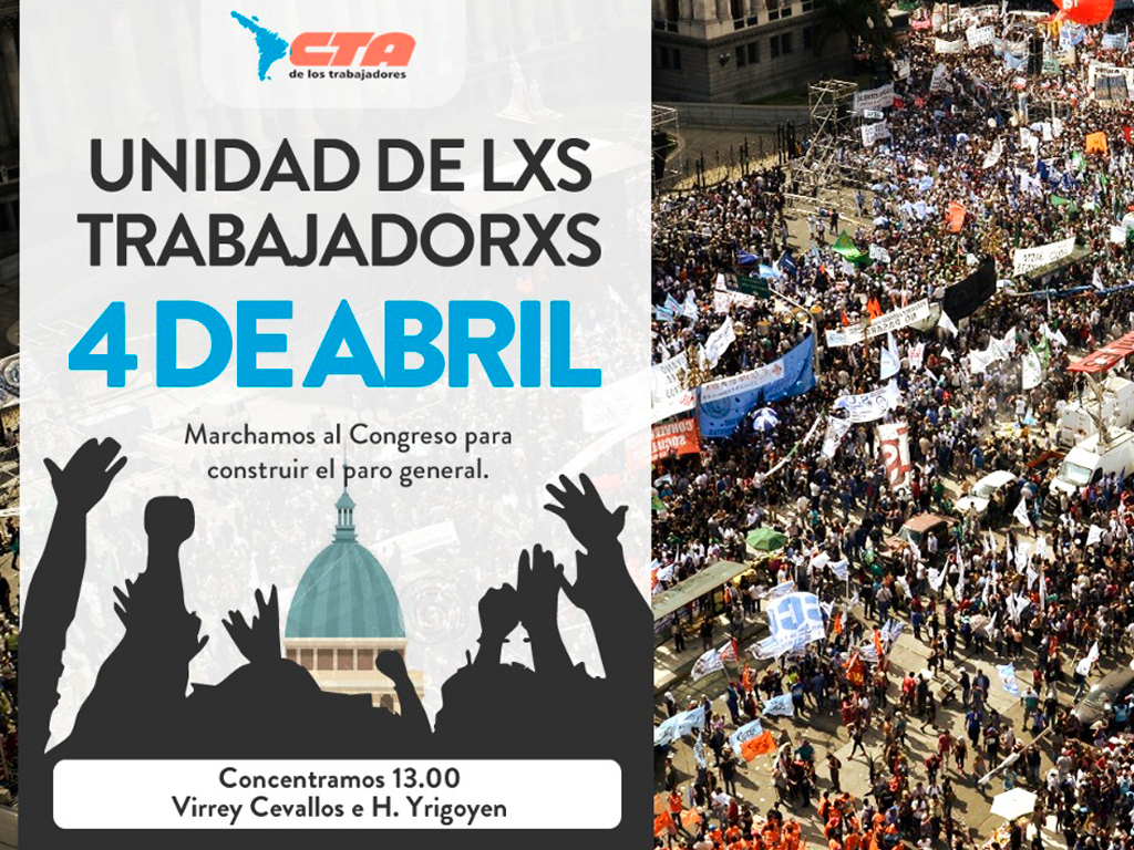 La CTA de los TRABAJADORES convocó, en confluencia con las demás centrales sindicales, a movilizarse el 4 de abril, para exigir al Congreso de la Nación que, de inmediato, declare el estado de emergencia alimentaria y nutricional; la emergencia tarifaria en los servicios públicos; la emergencia habitacional y la emergencia ocupacional en todo el ámbito del territorio argentino.