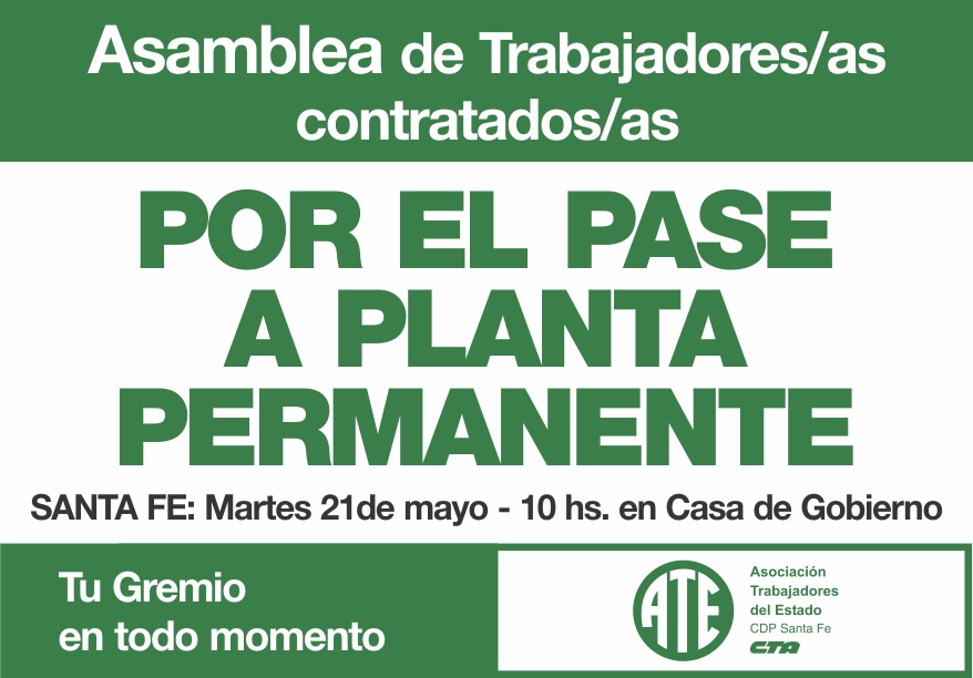 Este martes 21 de mayo a las 10 horas, en Casa de Gobierno, ATE realizará una asamblea general de trabajadores y trabajadoras de la Administración Pública provincial que se encuentren bajo diferentes modalidades contractuales en el Estado Provincial.