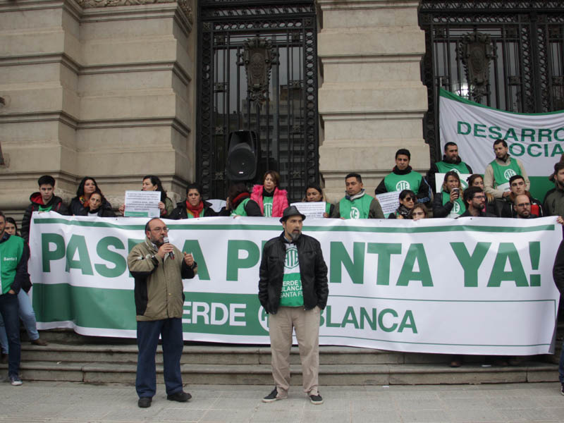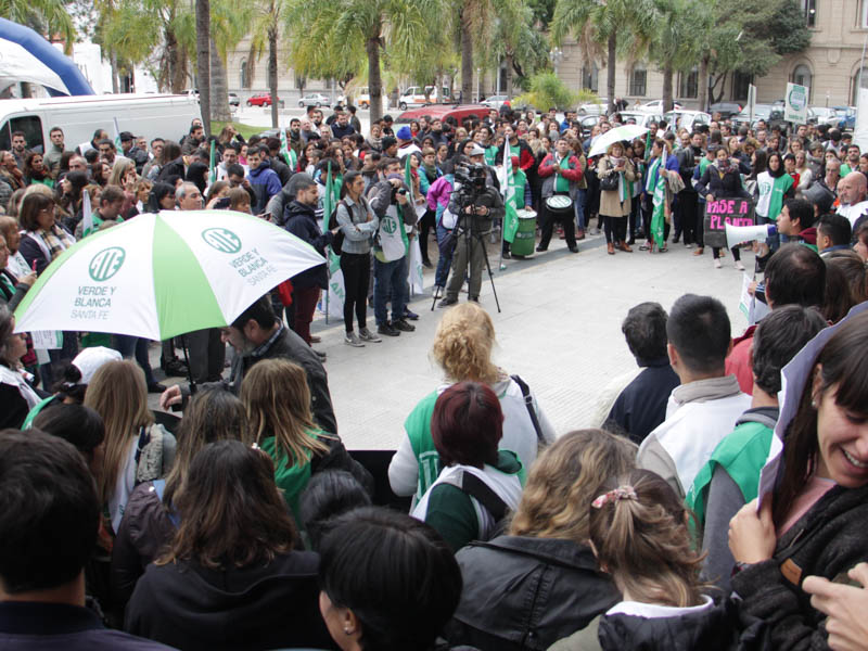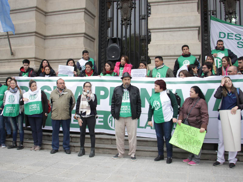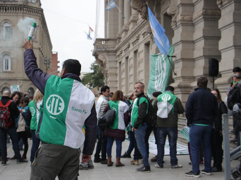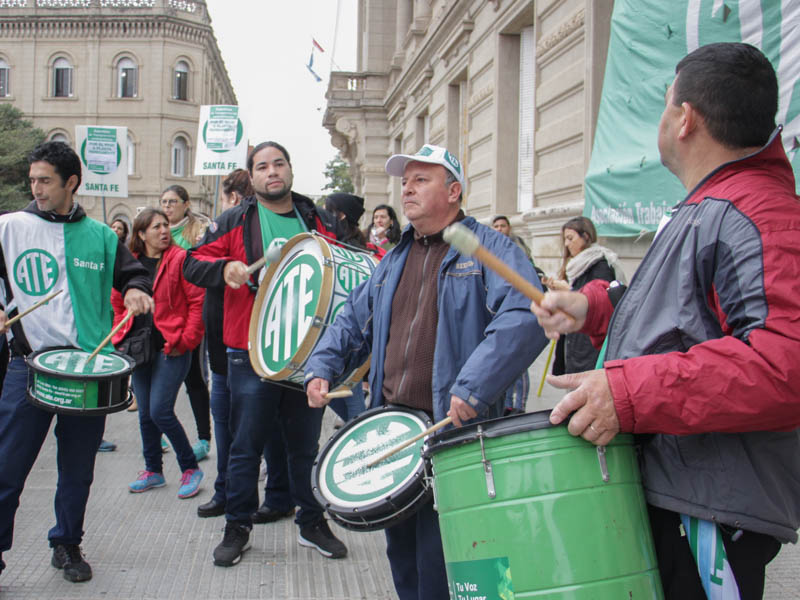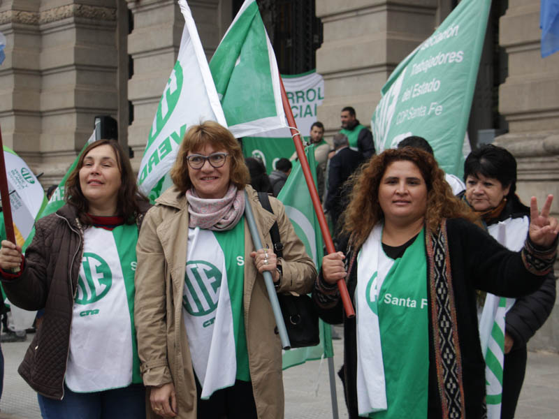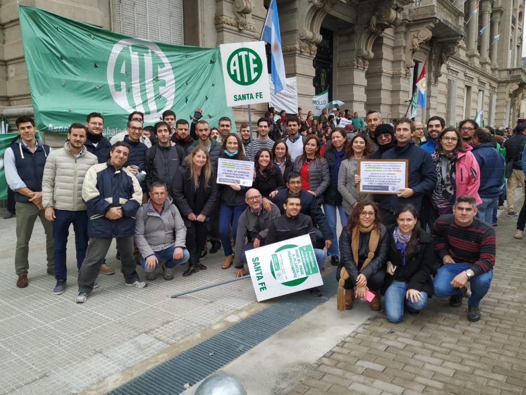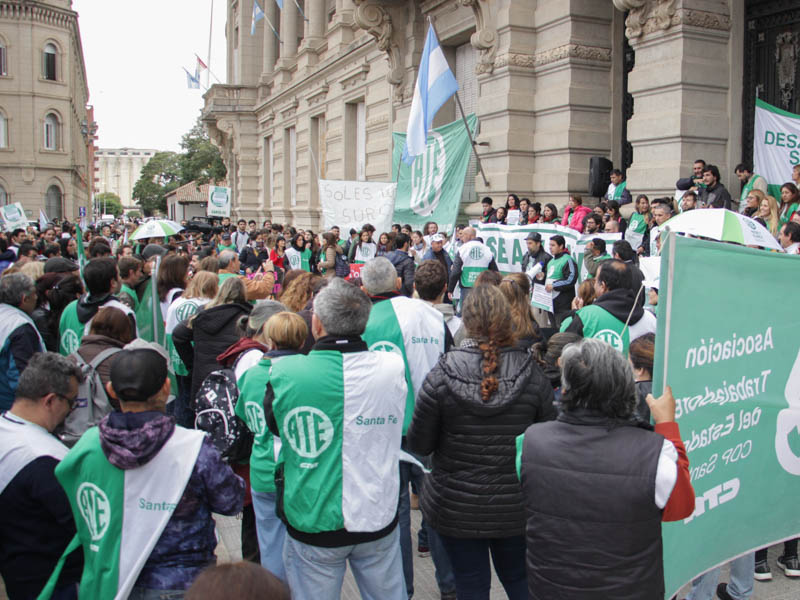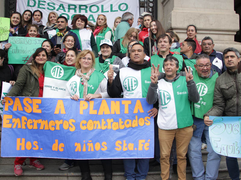 En la mañana de este martes 21, la Asociación Trabajadores del Estado -ATE- Santa Fe realizó una numerosa asamblea frente a Casa de Gobierno con activa participación de trabajadores contratados/as y en situación de precariedad laboral de distintos ministerios y reparticiones de diferentes puntos de la provincia. Participaron también delegados y trabajadores de planta acompañando el reclamo de sus pares.