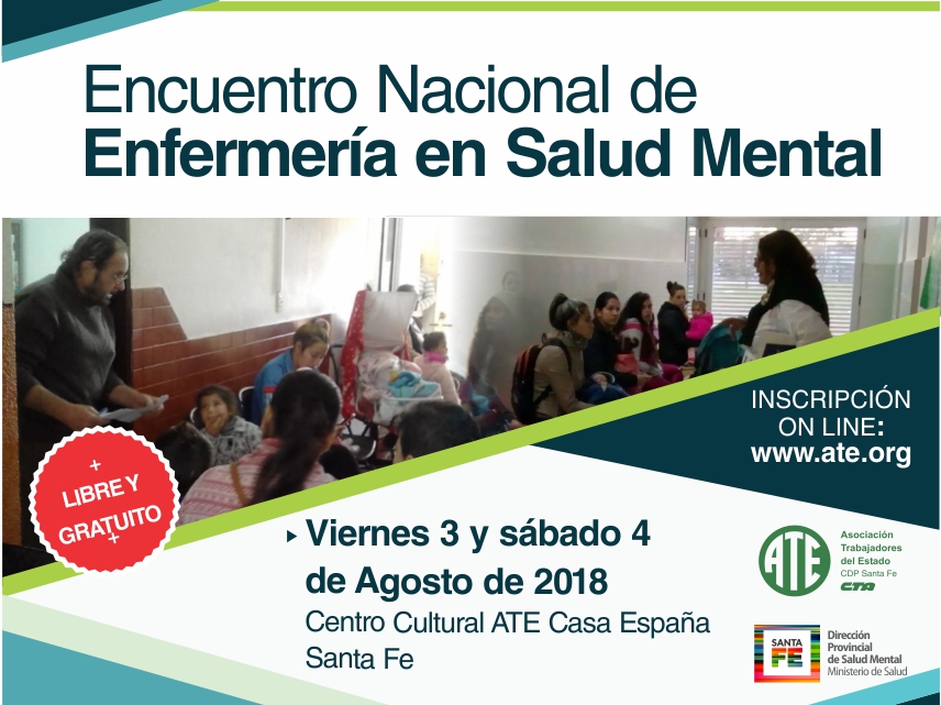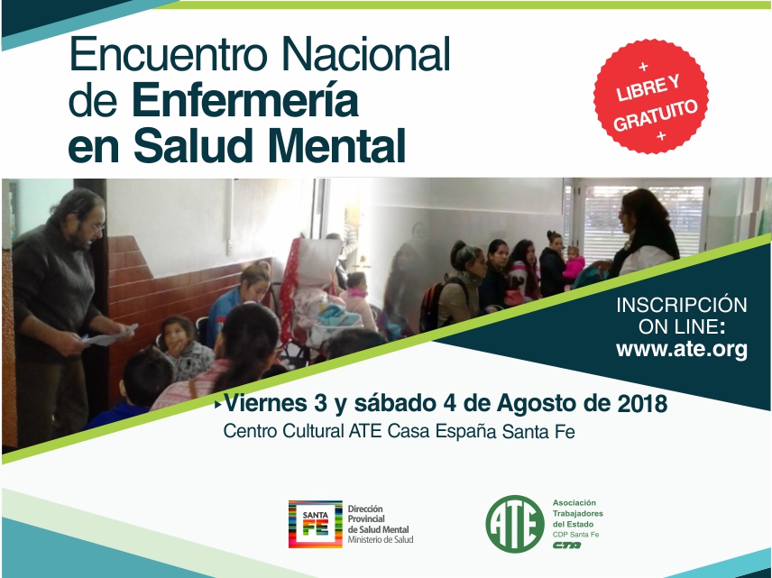 Se realizará los días 3 y 4 de agosto en ATE Casa España y está destinado a Enfermeras/os de todos los niveles de atención del sistema de salud. Libre y gratuito y organizado por ATE, con el auspicio de la Dirección de Salud Mental del Ministerio de Salud de la Provincia, las Conferencias, Talleres y Experiencias buscarán cumplir con las consignas: Por la plena implementación de la ley de Salud Mental y Adicciones y por la sustitución de las lógicas manicomiales. Cupos limitados.