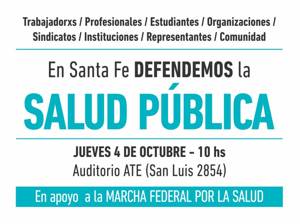 En la ciudad de Santa Fe, la Asociación Trabajadores del Estado -ATE- Santa Fe adhiere a la convocatoria de todos los espacios y sectores en defensa de la salud pública en consonancia con la gran Marcha Federal de Salud que se llevará a cabo en Capital Federal.