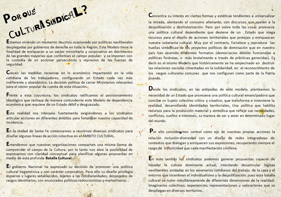 Desde el Espacio CULTURA SINDICAL consideramos que podemos contribuir a pensar y a recrear a través de diferentes lenguajes artísticos esta multidimensionalidad. El Festival está pensado para que afiliadxs de los diferentes sindicatos participen con intervenciones artísticas que muestren nuestras identidades. En este sentido, el Festival pretende dar relevancia a esta fecha con una propuesta de encuentro y disfrute en torno a nuestras Culturas Populares.