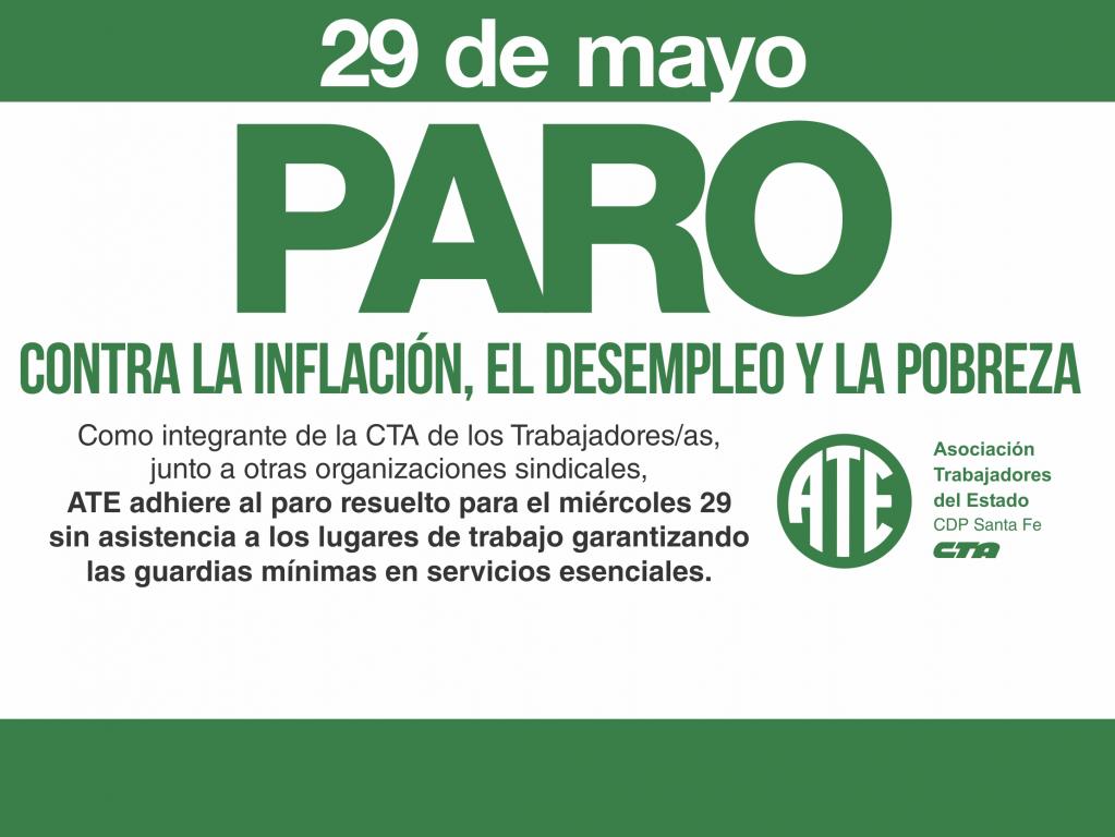 La Asociación Trabajadores del estado -ATE- Santa Fe como integrante de la CTA T, junto a otras organizaciones sindicales y sociales como la CTA Autónoma, CGT y el Frente Sindical, llevará a cabo un paro de 24 horas el próximo miércoles 29 de mayo.