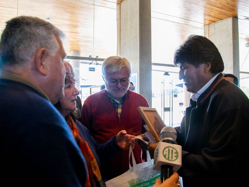 Evo Morales recibió diversos obsequios de ATE de manos de sus dirigentes por los que se mostró muy agradecido y contento de conocer el hotel de los trabajadores/as.