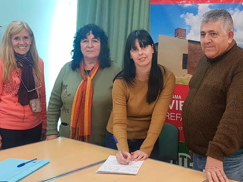 En primera instancia, con la presencia de integrantes del Consejo Directivo Provincial, firmó Erika Kellenberger, beneficiaria en los sorteos de octubre pasado, trabajadora de la Dirección Gral. de RR.HH del Ministerio de Infraestructura y Transporte. “Voy a terminar el baño de mi casa y algunos otros arreglos que tengo que hacer”, contó muy contenta.