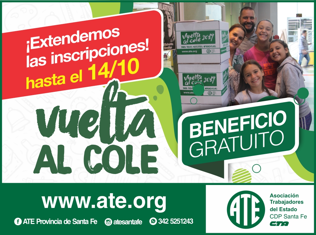 La Asociación Trabajadores del Estado -ATE- Santa Fe concluyó la inscripción de la campaña Vuelta al Cole 2020 el lunes 14 de octubre. La fecha de entrega se irá comunicando oportunamente según un calendario dispuesto para tal fin.
